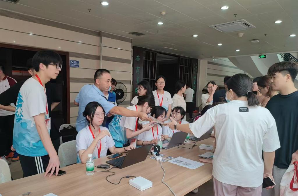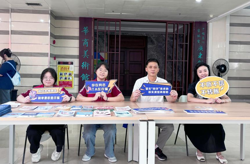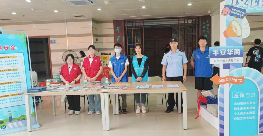 在迎新日新生报到处,我校联合雁塔派出所民警、荔湖街道办工作人员以展板、海报、安全手册讲解等形式,为新生积极开展预防电信诈骗及食品、交通、消防等安全知识的宣传与普及,提高新生的安全意识。炎炎烈日,我们提供水与纸巾,细节之处尽显关怀,以实际行动传递温暖。