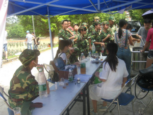 军训休息期间,学生排队喝凉茶