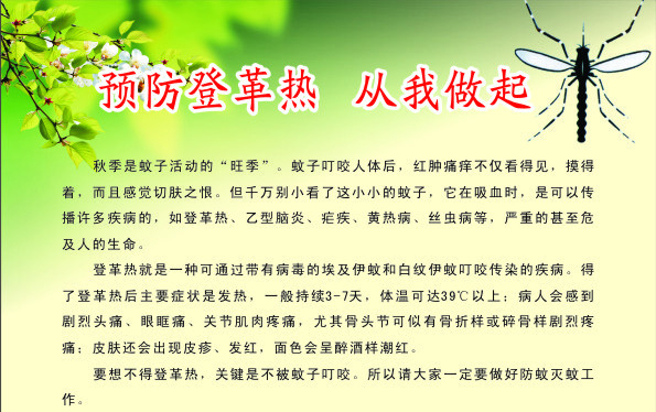 登革热是由登革病毒引起的急性蚊媒传染病。病毒经由病媒蚊(白纹伊蚊)传播给人类,人被带有病毒的蚊子叮咬便会受到感染,主要症状为高热、头痛、肌肉痛、骨骼关节痛,后眼眶痛和皮疹。