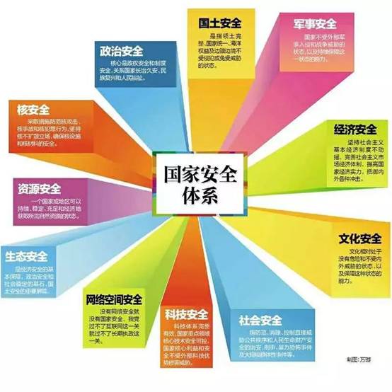 国家安全是国家的基本利益,是一个国家处于没有危险的客观状态,也就是国家没有外部的威胁和侵害也没有内部的混乱和疾患的客观状态。当代国家安全包括11个方面的基本内容,即国民安全、领土安全、主权安全、政治安全、军事安全、经济安全、文化安全、科技安全、生态安全、信息安全和核安全。