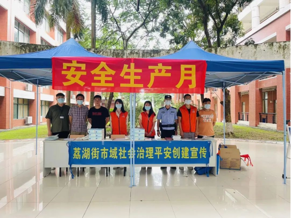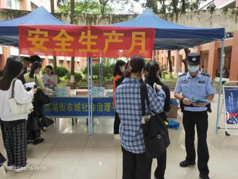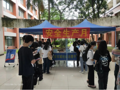 为进一步增强广大师生安全意识,提高师生安全文化素养,防范和遏制生产安全事故发生,后勤保卫办公室联合荔湖街道办事处于2022年6月16日上午在励志楼开展了以“遵守安全生产法 当好第一责任人”为主题的“安全生产月”咨询日宣传活动。