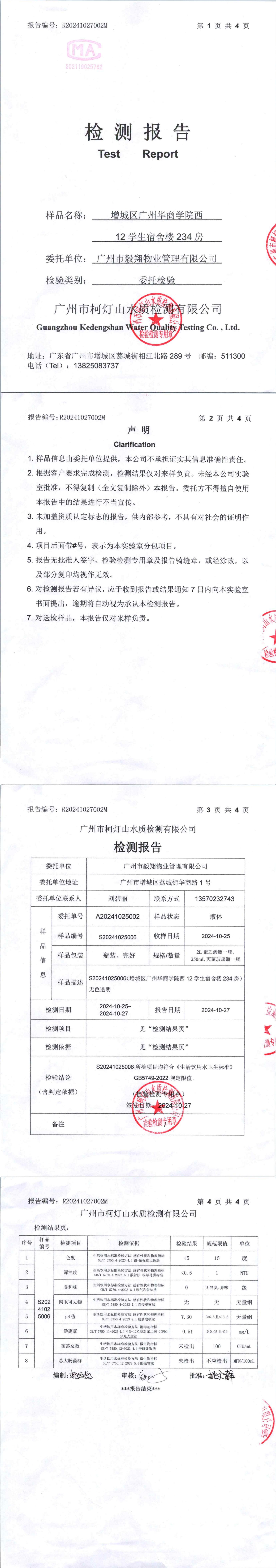 增城区广州华商职业学院A1弘毅楼702房自来水质检测报告